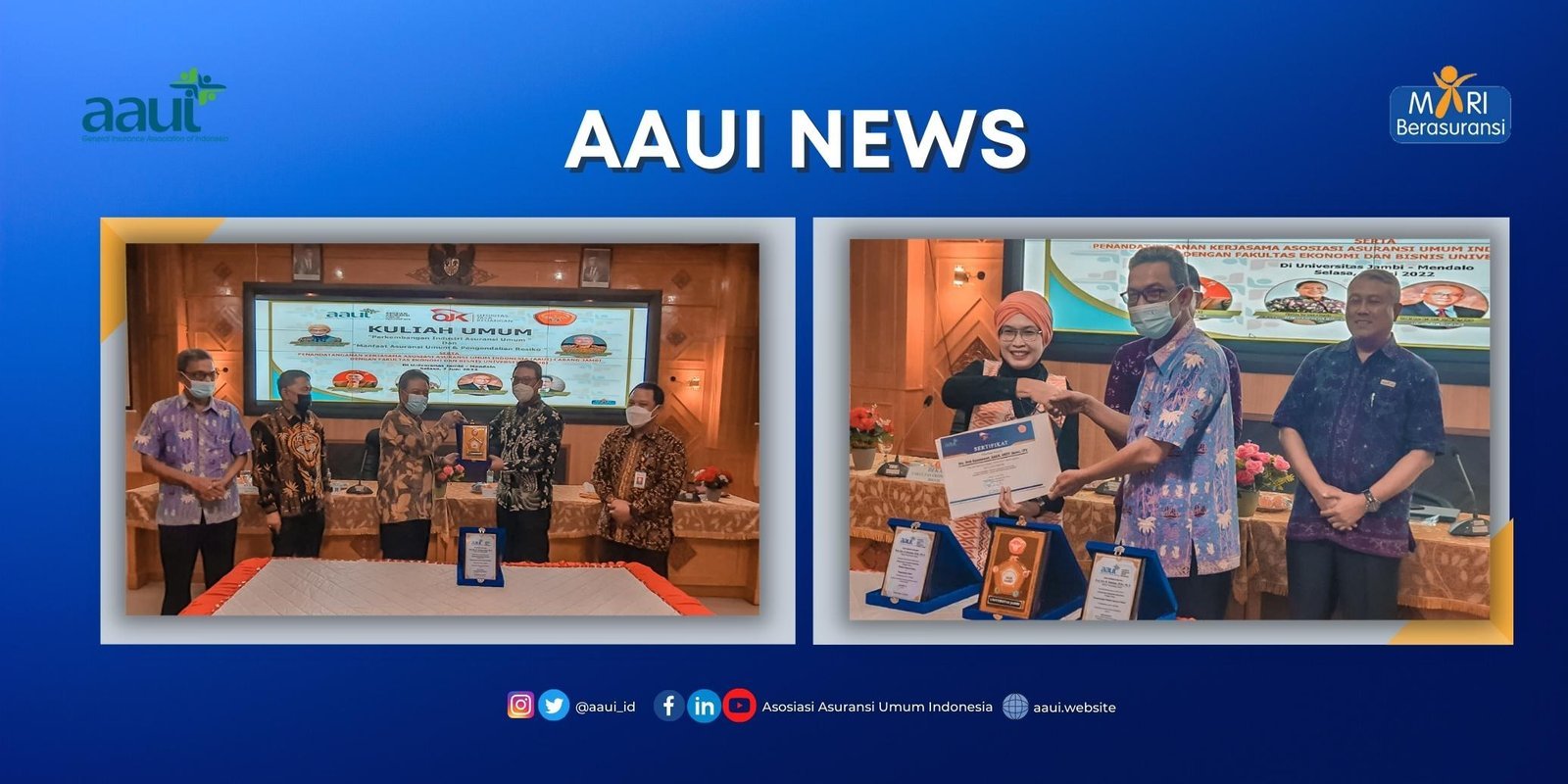 Asosiasi Asuransi Umum Indonesia Cabang Jambi menggelar kuliah umum bersama Universitas Jambi pada Selasa, 7 Juni 2022 di Ruang Rapat Senat Universitas Jambi, Mendalo, Jambi. Acara ini resmi dibuka oleh Rektor Universitas Jambi Prof Drs H Sutrisno M.Sc., Ph.d. dengan penyampaian pantun sebagai khas adat melayu jambi. Dalam kesempatan ini, Bern Dwyanto Direktur Eksekutif AAUI Pusat bersama dengan Diah Kusumawati Selaku Manajer Bidang Penelitian,Pengembangan, dan Hubungan Antar Lembaga hadir dan berpartisipasi dalam acara kuliah umum yang diselenggarakan oleh Universitas Jambi yang mengangkat tema tentang perkembangan industri asuransi umum serta manfaat dan pengendalian risikonya. Dalam sambutannya Bern menyampaikan Pandemi yang melanda Indonesia ini memang membuat industri asuransi terkontraksi oleh keadaan. Namun, setelah menjalani lebih dari setahun, industri asuransi umum mulai bangkit dan beradaptasi dengan kondisi ini yang akhirnya sekarang sudah mulai tumbuh. Ia menambahkan ini artinya bisnis asuransi umum masih menarik dan terlihat masih bertumbuh walaupun di masa sulit. Menurutnya banyak sekali produk asuransi yang sudah dijual oleh industri asuransi namun untuk minat pembeli masih tergolong terlalu sedikit. “Ini menjadi tugas kita untuk mengenalkan seberapa pentingnya asuransi bagi masyarakat,” katanya. Selain itu, Ketua AAUI Cabang Jambi Silvansris menyampaikan kegiatan kuliah umum yang bekerjasama dengan Universitas Jambi ini merupakan salah satu upaya dari industri asuransi umum untuk menambah wawasan serta ilmu tentang keterkaitan mata kuliah manajemen risiko dengan asuransi. Kerjasama ini juga diharapkan mampu menyaring generasi muda khususnya mahasiswa untuk terjun di industri asuransi umum. “Kami harap, adik-adik mahasiswa ini akan paham dengan dunia asuransi serta jenis-jenisnya. Nantinya adik-adik ini bisa mendapatkan kesempatan magang ataupun kerja di perusahaan asuransi yang ada di Jambi,” jelasnya. Pada acara Kuliah Umum ini, AAUI Cabang Jambi dan Universitas Jambi juga melakukan penandatanganan Memorandum Of Understanding (MOU) antara AAUI Cabang Jambi bersama Universitas Jambi tentang penyelenggaraan kerjasama yang telah dilakukan.